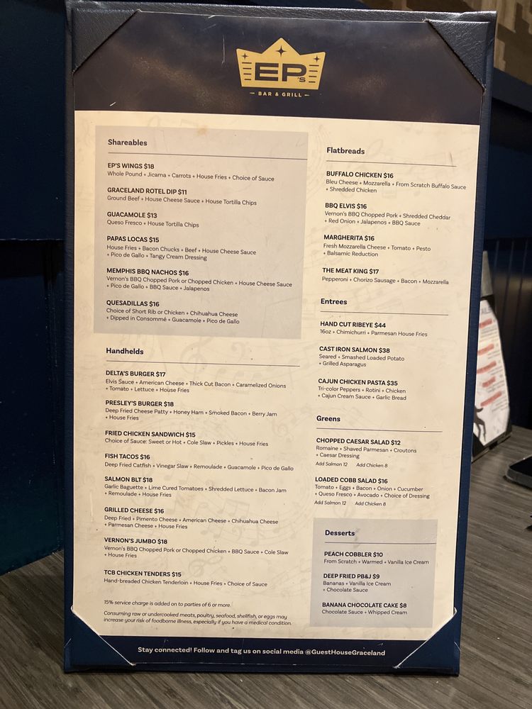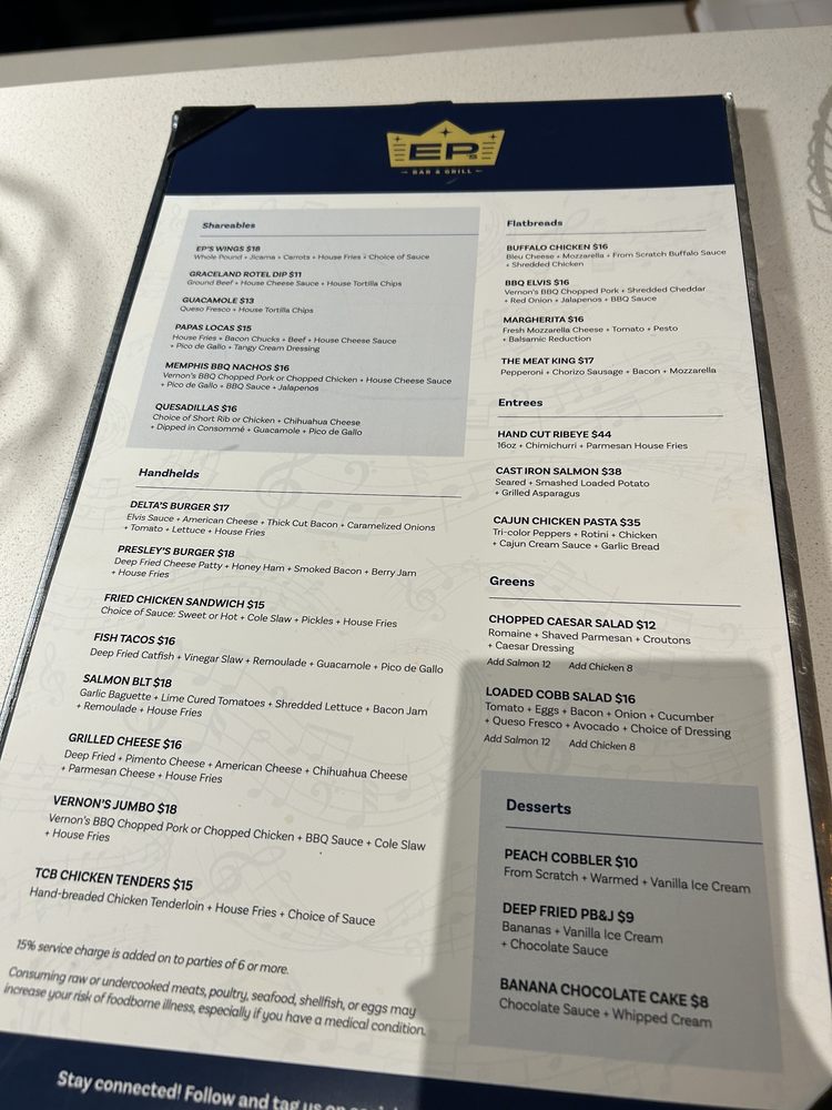 EP’s Bar & Grill, located at 3600 Elvis Presley Blvd in Memphis, TN, is a casual and touristy spot offering a variety of amenities such as takeout, delivery, outdoor seating, and free Wi-Fi. With a full bar, TV screens, and a drive-thru, this restaurant provides a convenient and enjoyable dining experience. Their menu caters to all ages, making it a great choice for families or group gatherings. The diverse selection of dishes is perfect for both lunch and dinner. The friendly waitstaff and private lot parking add to the overall positive dining experience at EP’s Bar & Grill. Don't miss out on trying their signature dishes, as they are sure to impress with their unique flavors and high-quality ingredients. Visit EP’s Bar & Grill today and enjoy a memorable dining experience.